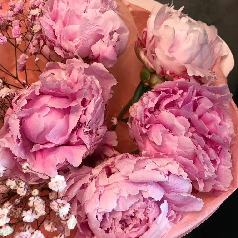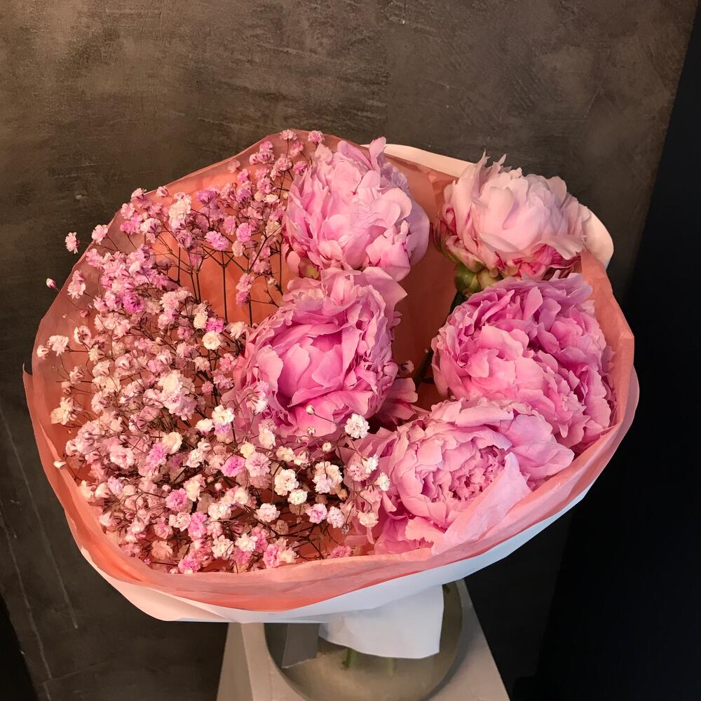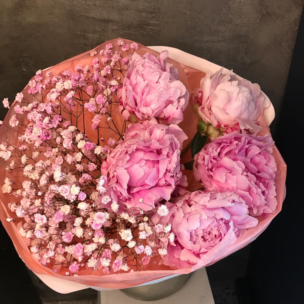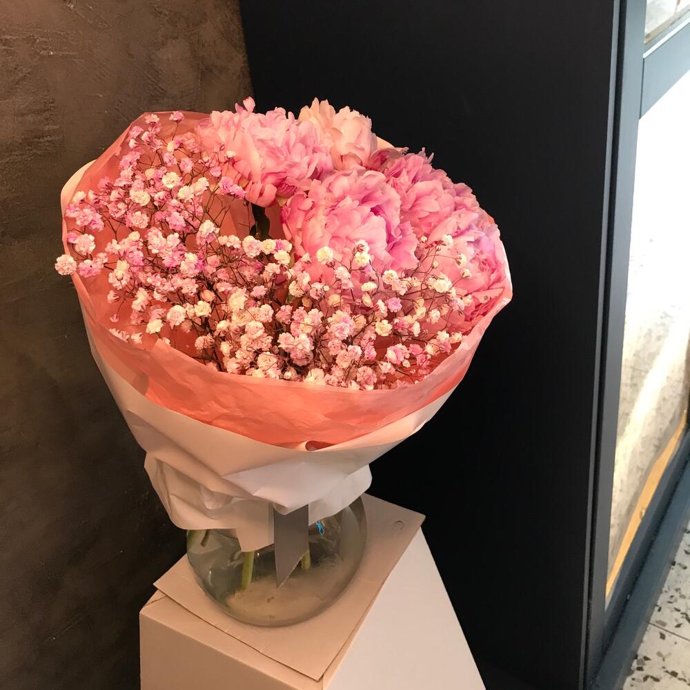 Авторский букет из пионов и гипсафилы