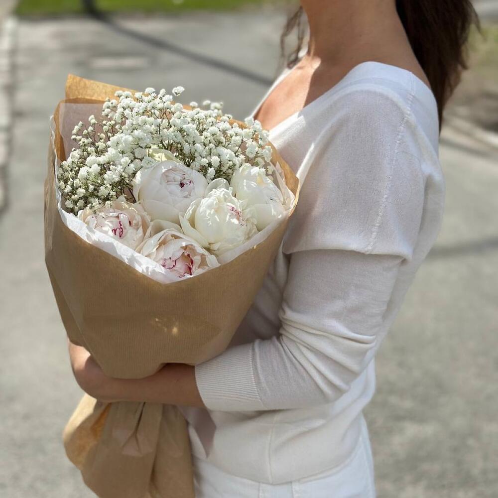 Гипсофила – 2 шт.Подарочная упаковка – 1 шт.Средство для продления жизни цветов – 1 шт.пионы белые италия – 5 шт.