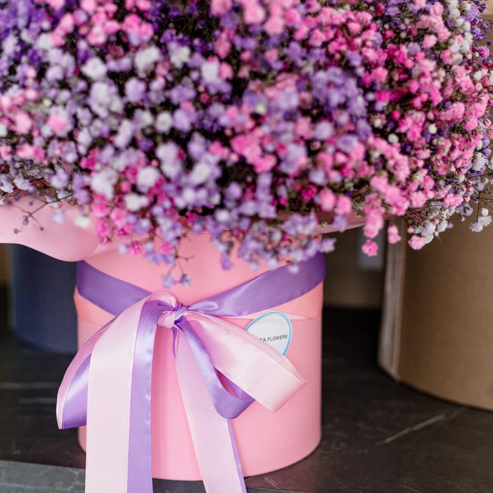 “Сиреневый туман” – композиция из гипсофилы в шляпной коробке