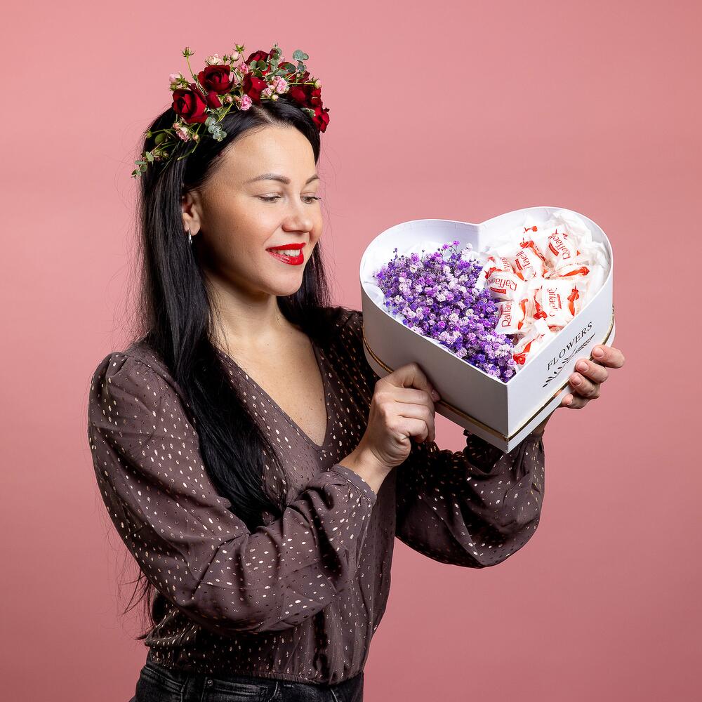 “Сладкое сердце ” – цветочная композиция с сладостями в коробке “Сердце”