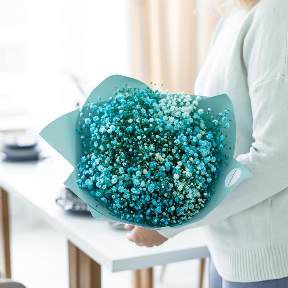 гипсофила цветная – 7 шт.пленка корейская дизайнерская – 2 шт.Лента атласная – 1 шт.Упаковка транспортировочная пленка – 1 шт.инструкция по уходу за цветами – 1 шт.