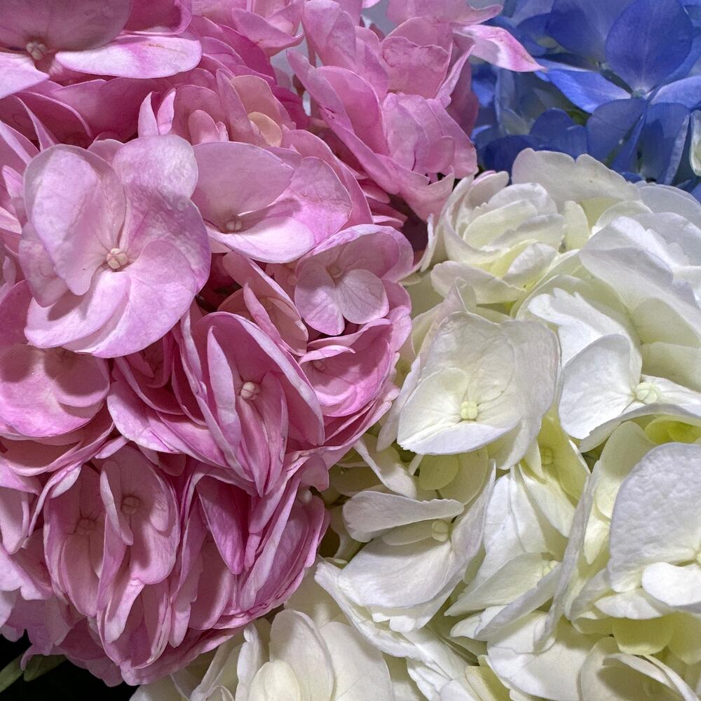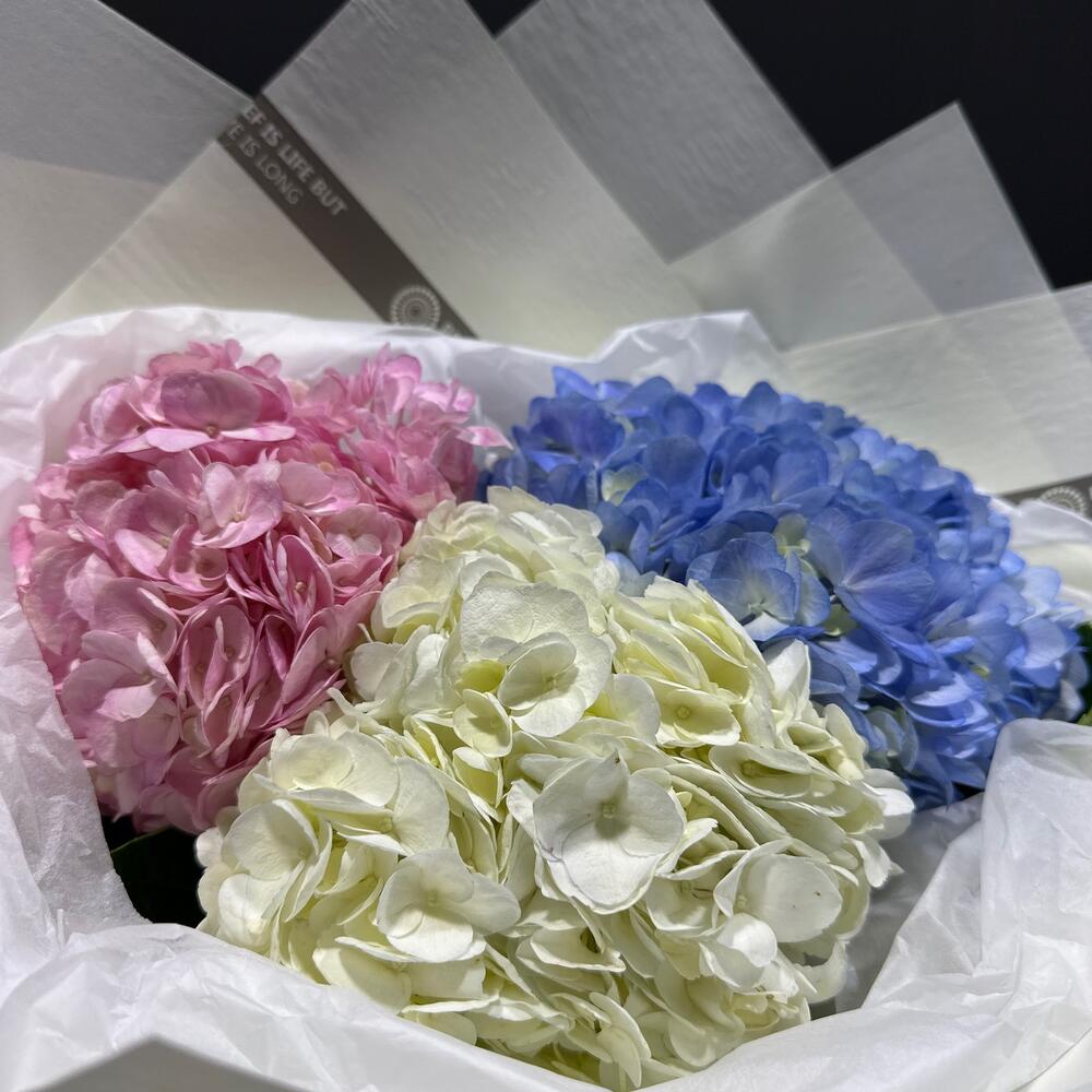 Букет 'Гармония гортензий' воплощает в себе нежность и изысканность с помощью пышных гортензий различных оттенков, создавая волшебную атмосферу спокойствия."