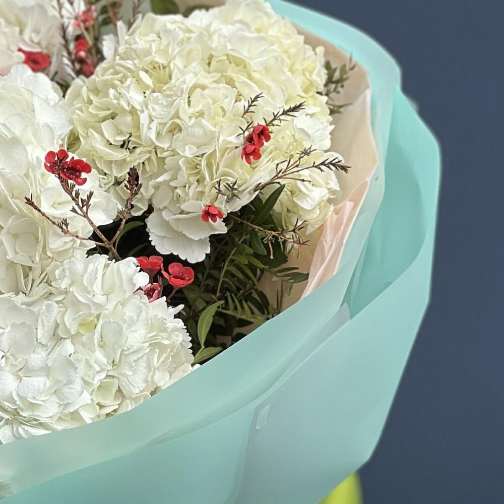 Гортензия – 5 шт. фисташка зелень – 7 шт. Хамелациум – 3 шт. Упаковка дизайнерская – 6 шт. Лента – 1 шт.