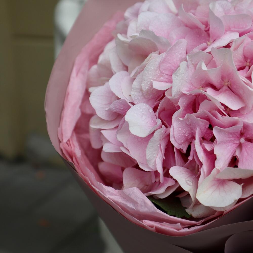 Гортензия розовая – 1 шт.Фетр – 2 шт.Упаковка корейская пленка – 3 шт.Лента репсовая – 1 шт.