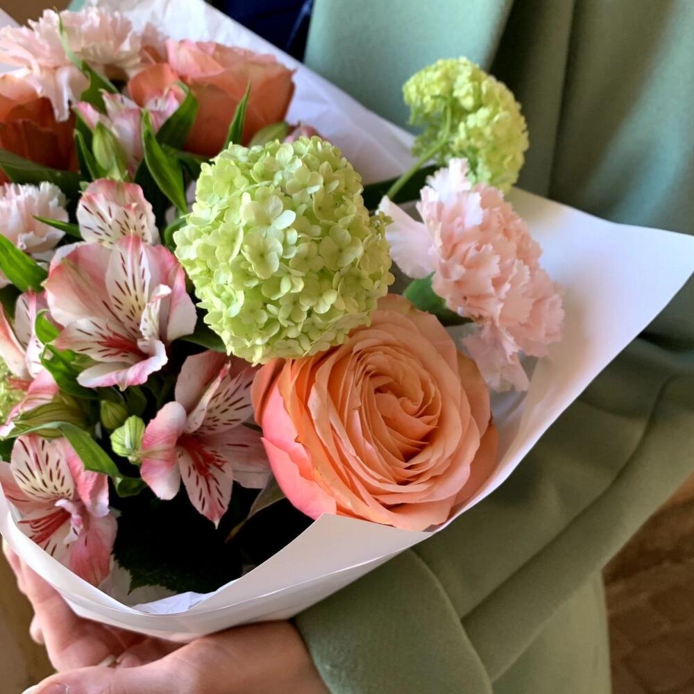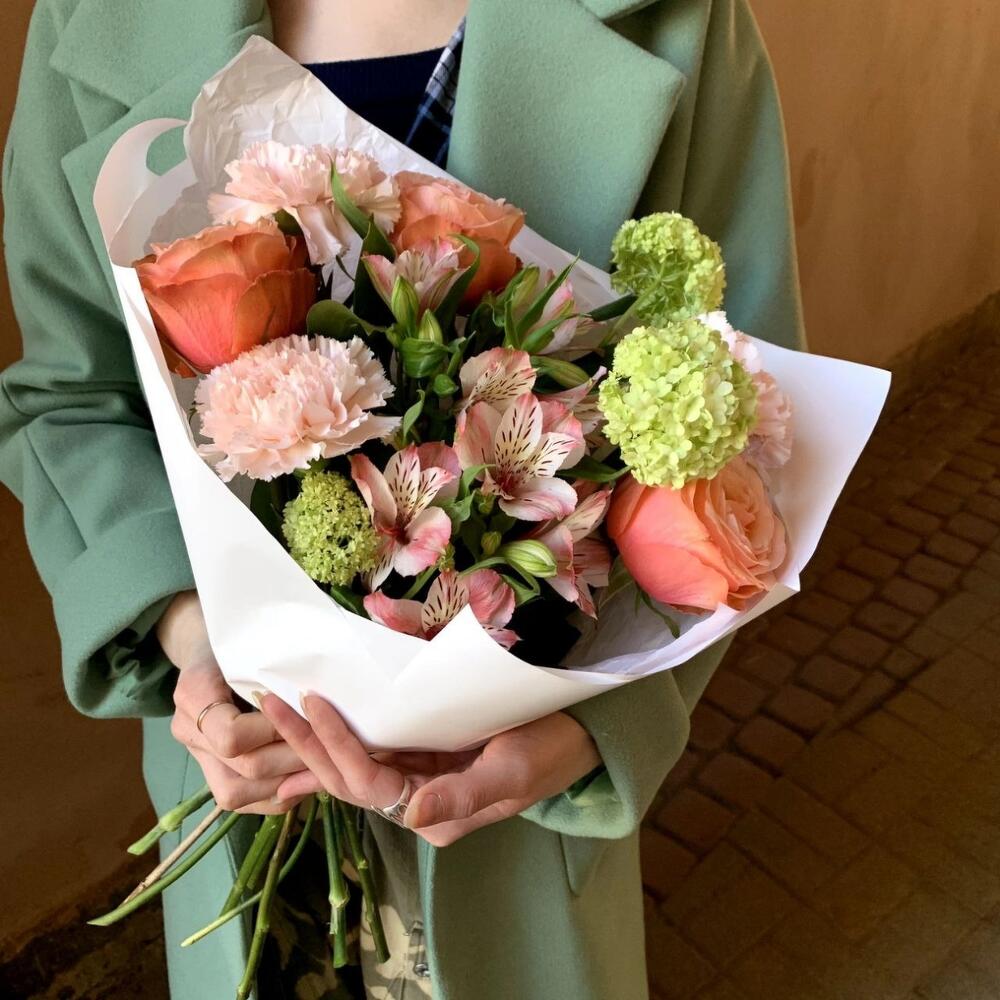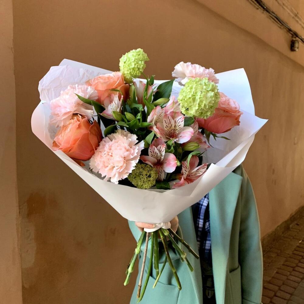 Альстромерия – 2 шт.Вибурнум – 1 шт.Гвоздика розовая – 2 шт.Рускус сочи – 2 шт.Роза кахала – 3 шт.Авторская упаковка – 1 шт.