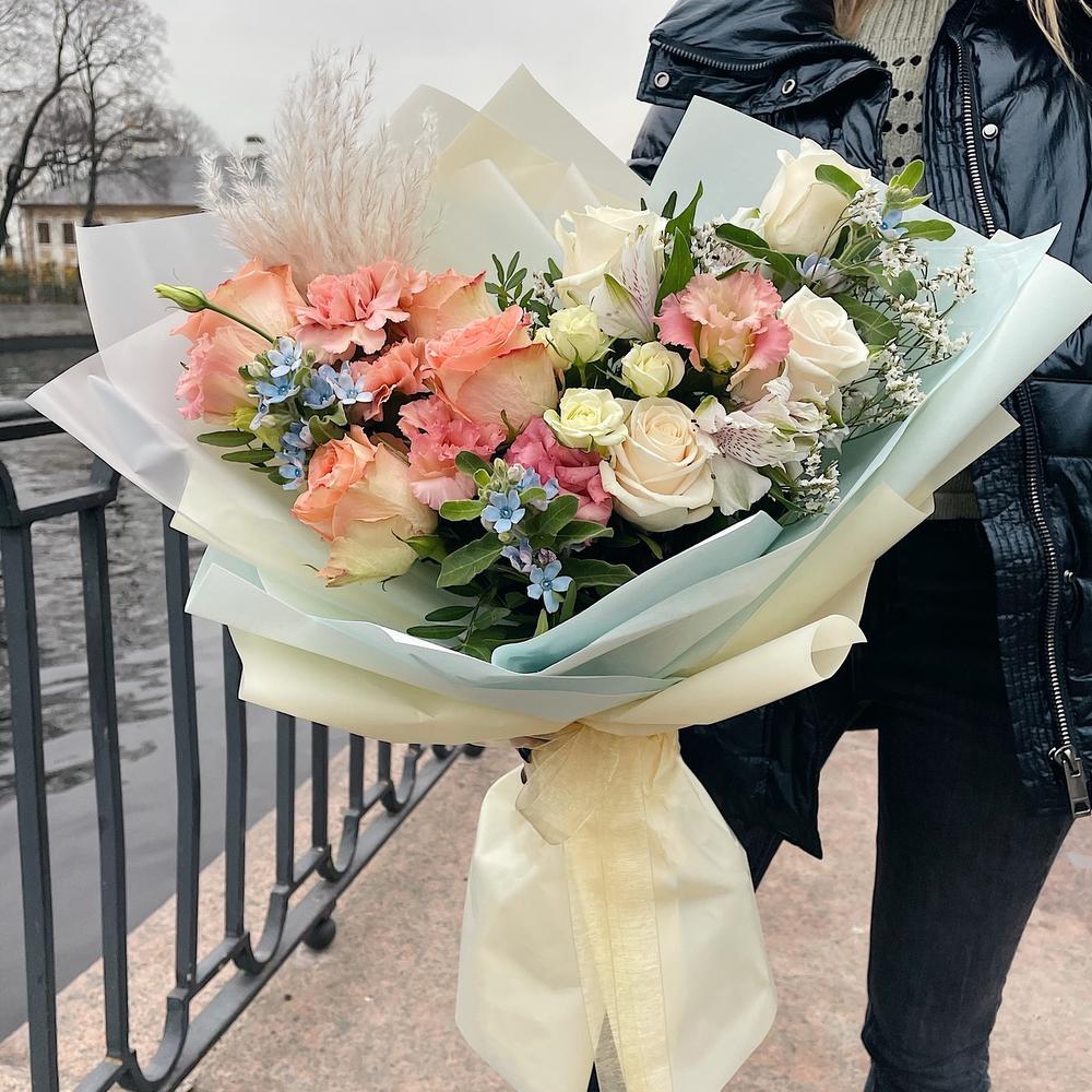 Альстромерия – 2 шт.Роза кустовая – 1 шт.Диантус – 2 шт.Роза белая – 4 шт.Фисташка – 2 шт.Оксипеталум – 3 шт.Роза персиковая – 5 шт.Лимониум белый – 1 шт.Лизиантус алиса пинк – 4 шт.кортодерия – 1 шт.