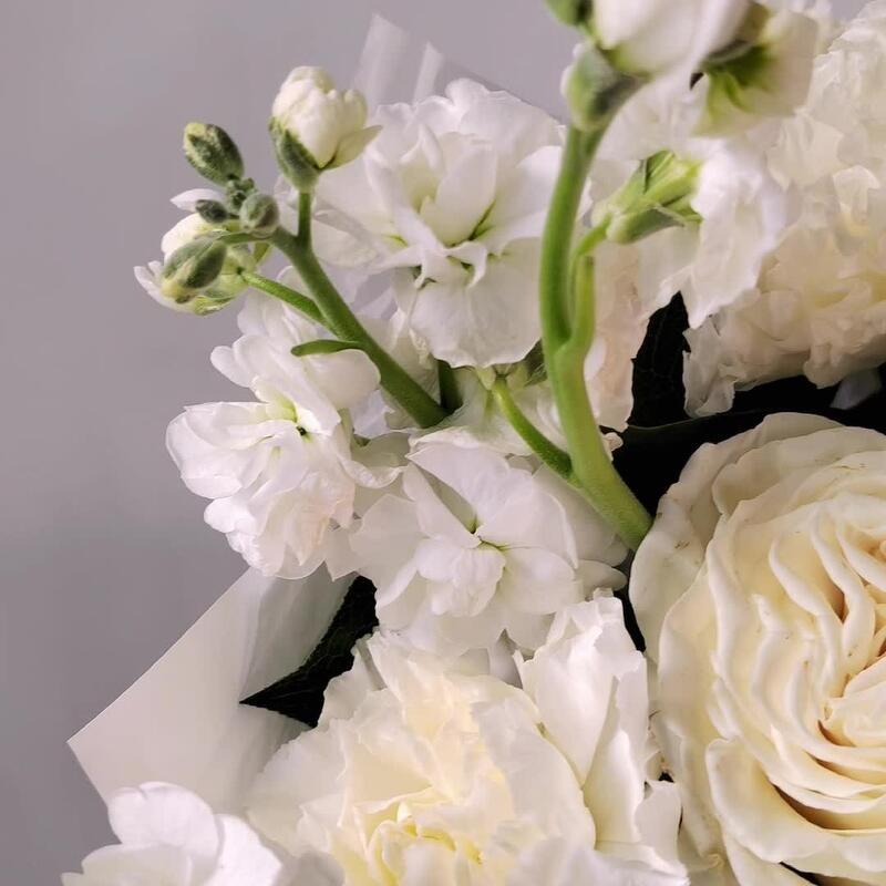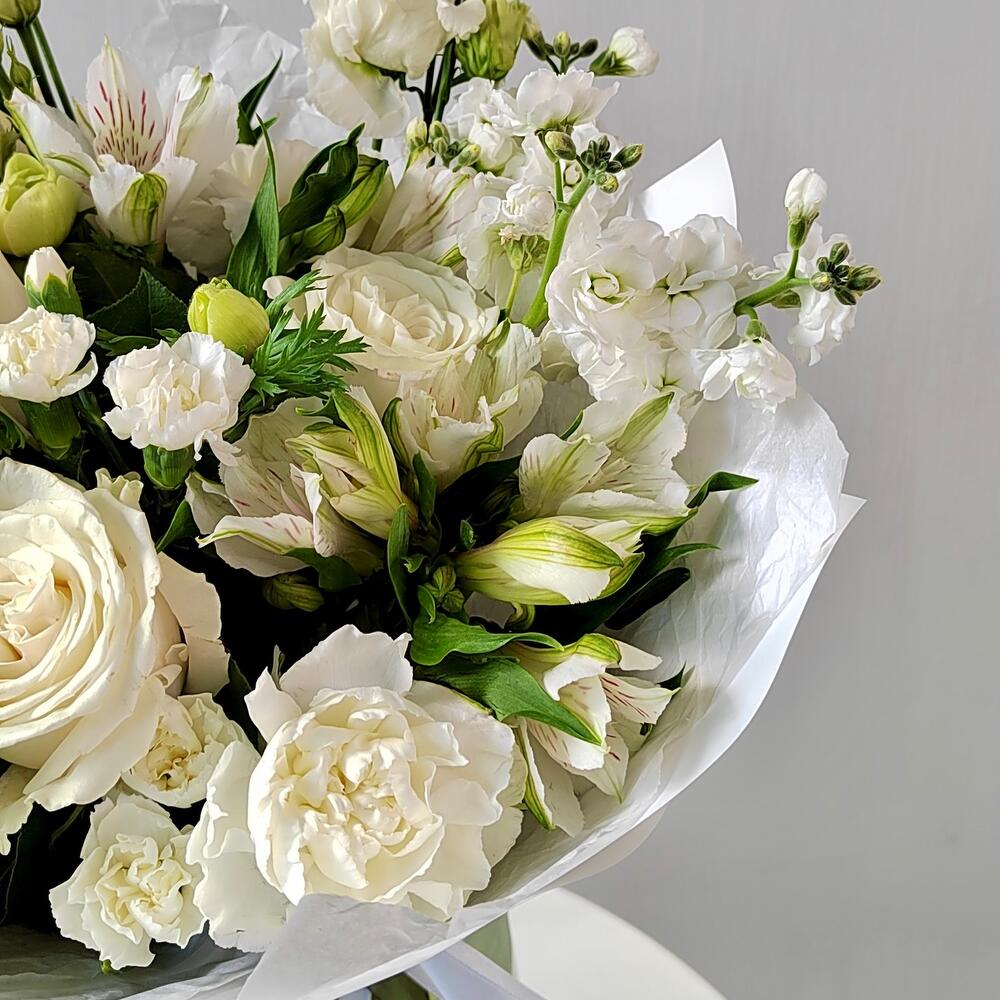 Альстромерия – 3 шт.Маттиола – 3 шт.Эустома – 2 шт.Лента атласная – 4 шт.Упаковка дизайнерская – 5 шт.Роза белая эквадор – 3 шт.гвоздика сортовая белая – 5 шт.зелень фисташка – 3 шт.