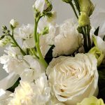 Белый букет с розами, ароматными маттиолами и эустомой
