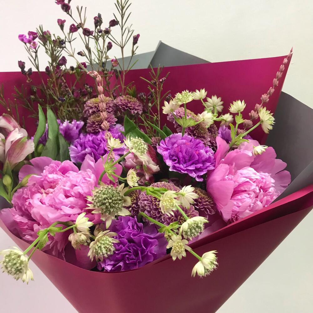 Альстромерия – 2 шт.Лаванда – 2 шт.Пион – 2 шт.Хризантема Сантини – 3 шт.Гвоздика – 5 шт.Хамелациум – 1 шт.Астранция – 2 шт.Открыточка с вашими пожеланиями – 1 шт.Авторская упаковка – 1 шт.