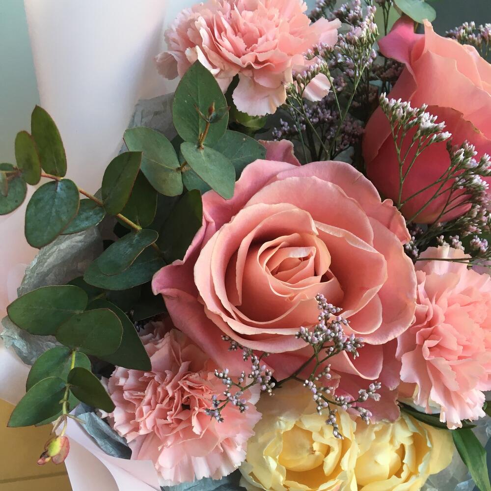 Роза – 2 шт.Гвоздика – 3 шт.Альстромерия – 1 шт.Роза кустовая – 1 шт.Лимониум – 1 шт.Упаковка дизайнерская – 1 шт.