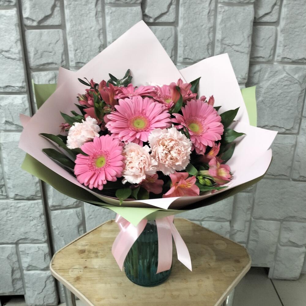 Упаковка – 2 шт.Лента атласная – 1 шт.Гвоздика сортовая – 4 шт.Альстромерия Микс Европа – 3 шт.гербера стандарт – 5 шт.