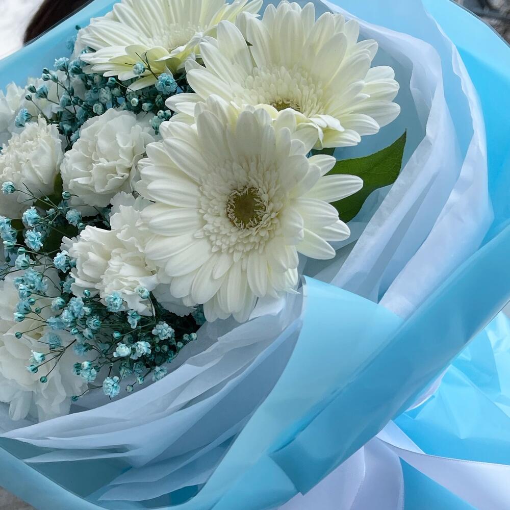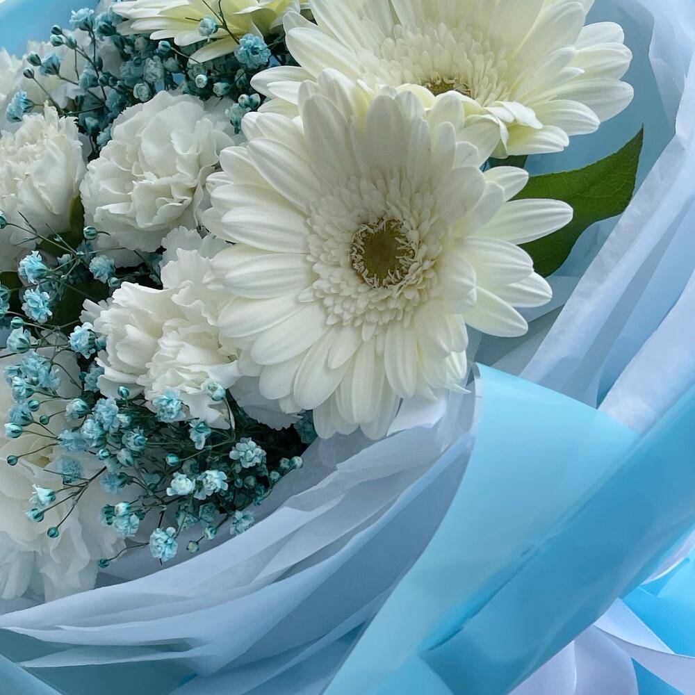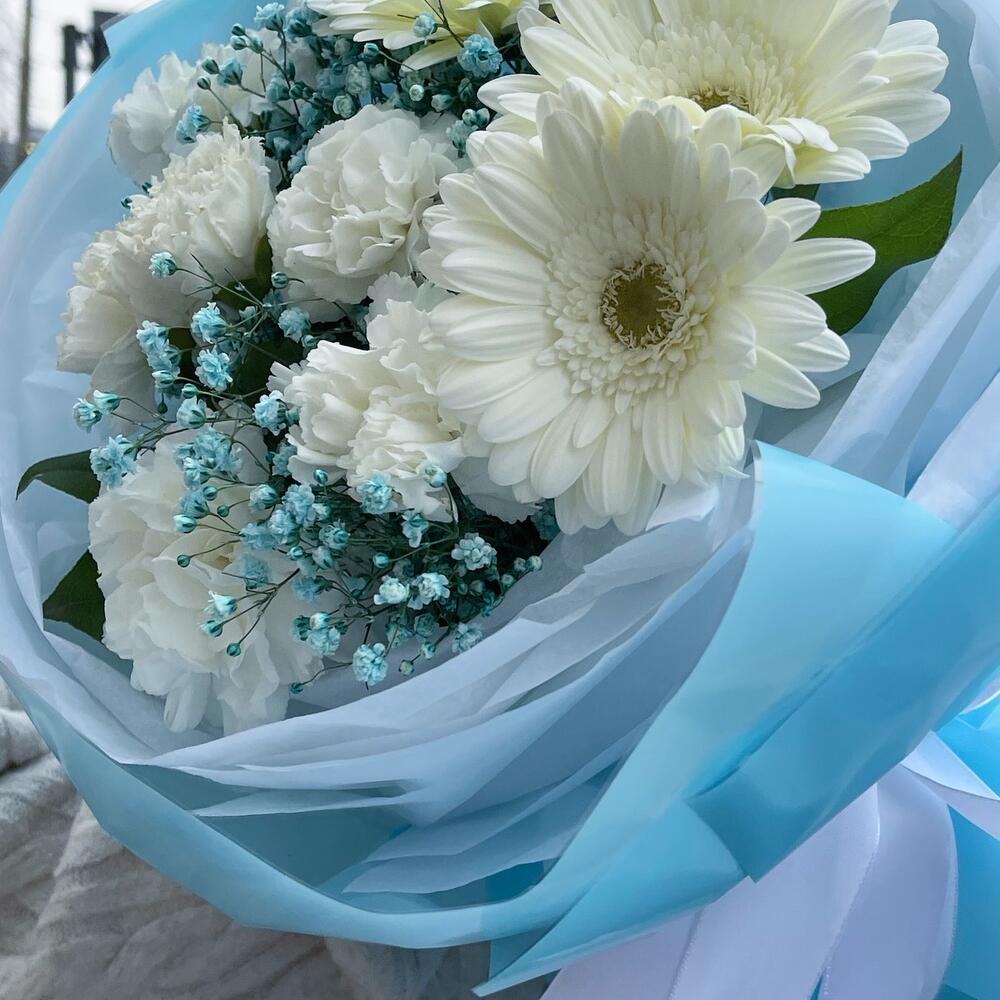 Гербера белая – 3 шт.Гвоздика белая – 5 шт.Салал листья – 5 шт.Гипсофила – 2 шт.Пленка матовая – 4 шт.Тишью – 4 шт.