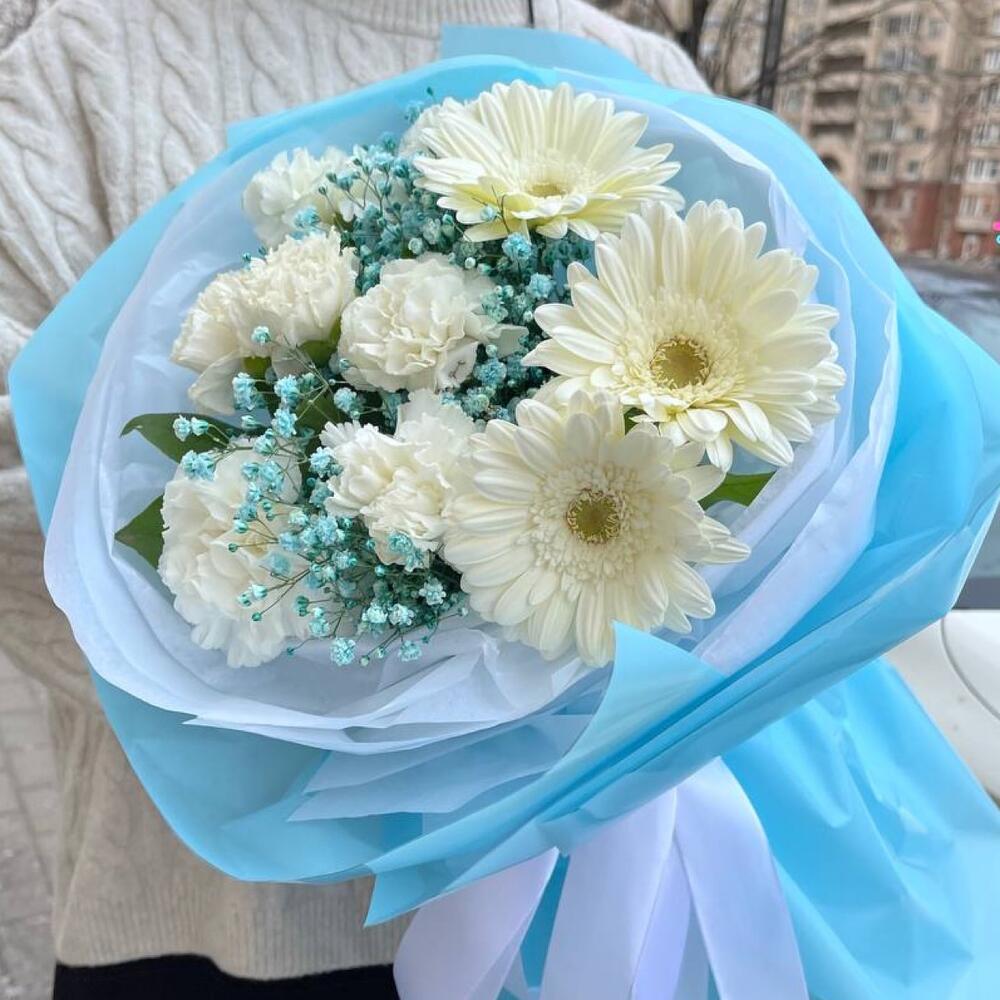 Гербера белая – 3 шт.Гвоздика белая – 5 шт.Салал листья – 5 шт.Гипсофила – 2 шт.Пленка матовая – 4 шт.Тишью – 4 шт.