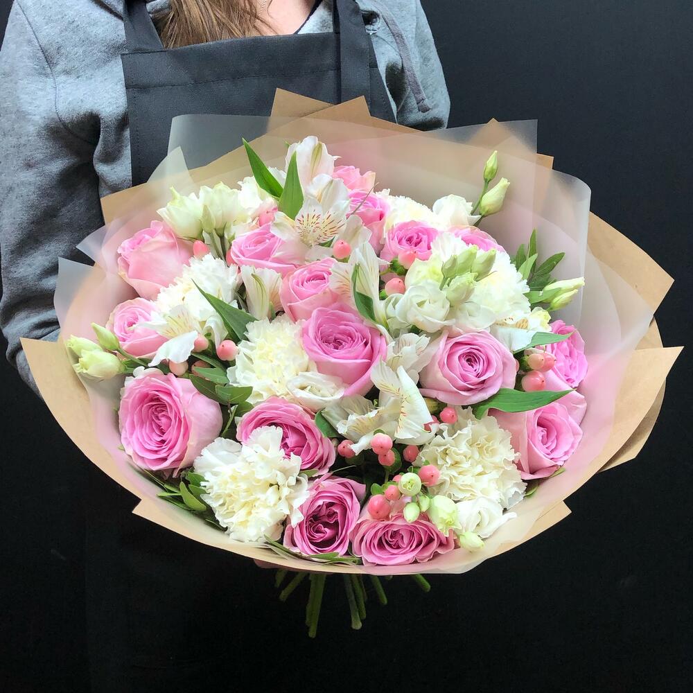 Роза – 17 шт.Диантус – 6 шт.Лизиантус – 3 шт.Альстромерия – 3 шт.Фисташка – 5 шт.Крафт – 1 шт.Гиперикум – 5 шт.