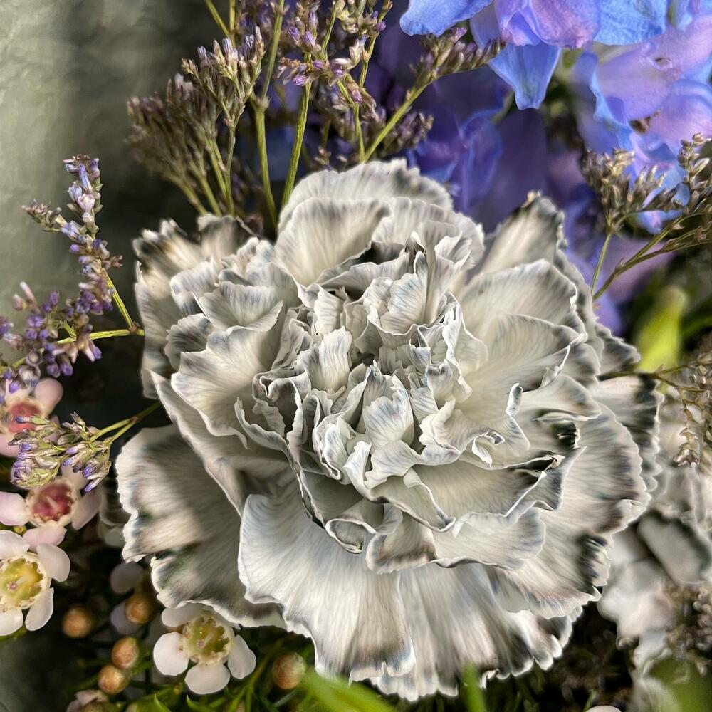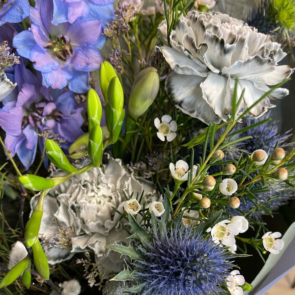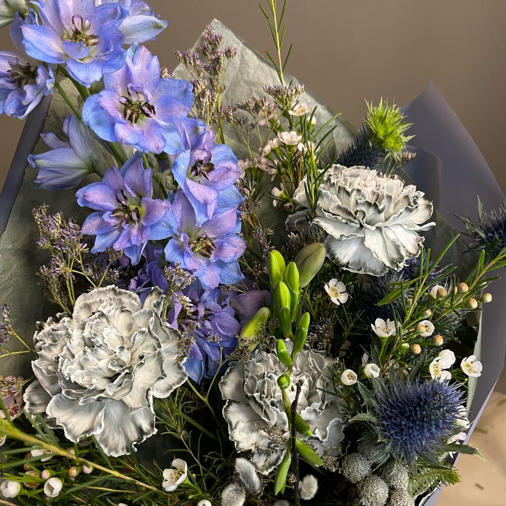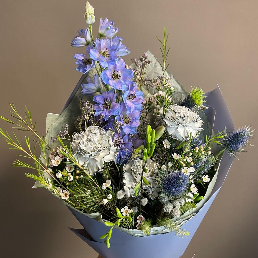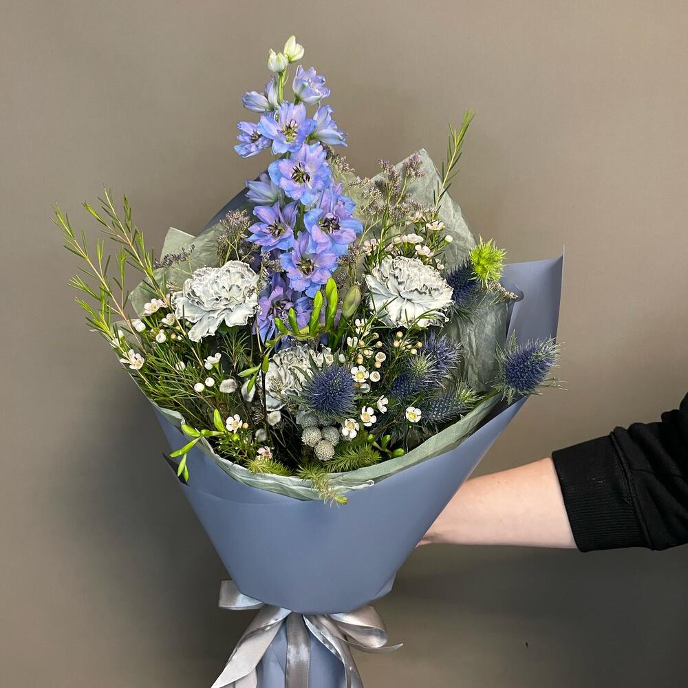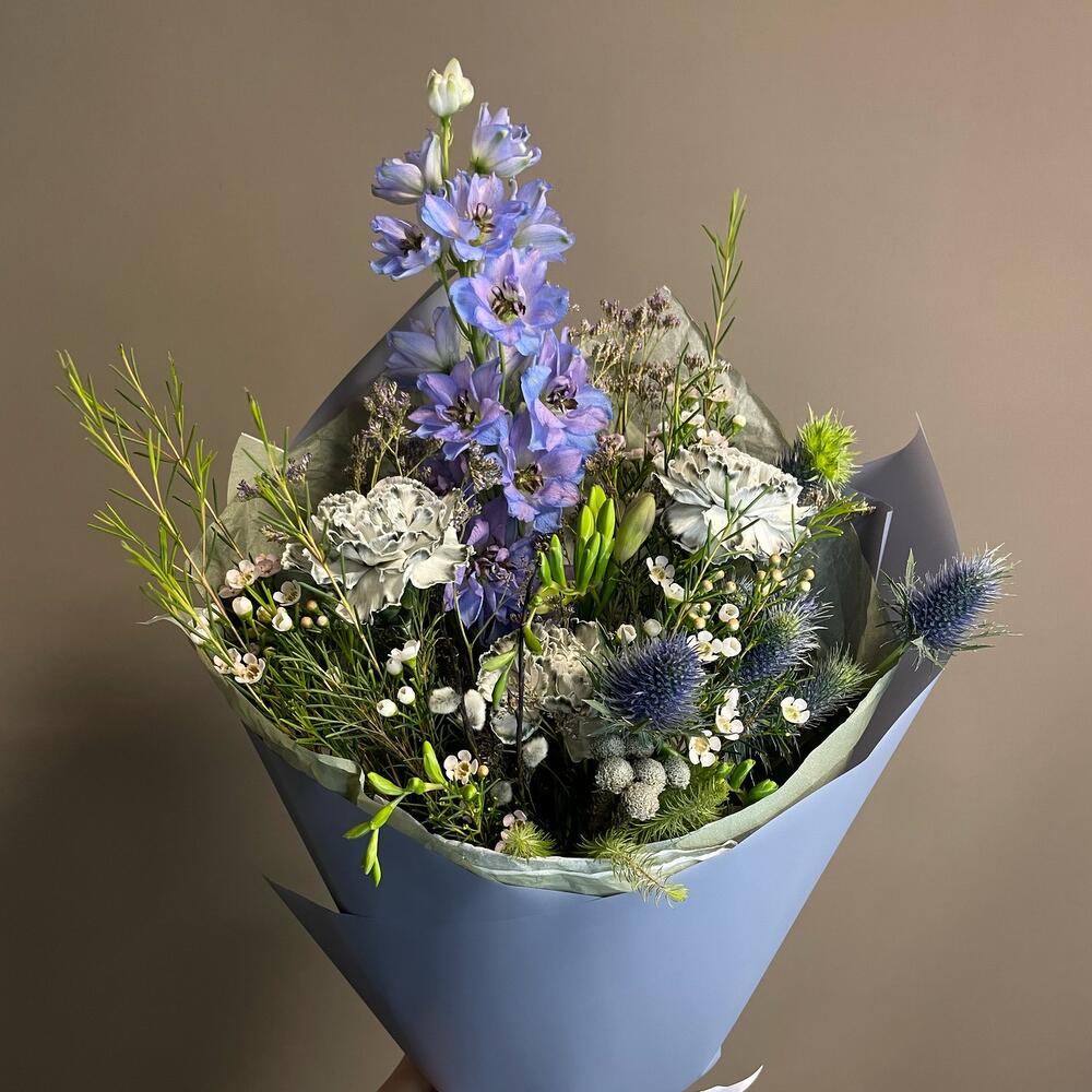 Верба – 2 шт.Лента – 2 шт.Лимониум – 2 шт.Фрезия фиолетовая – 2 шт.Пленка матовая – 2 шт.Эрингиум синий – 1 шт.Дельфиниум голубой – 1 шт.Ваксфлауэр хамелациум – 3 шт.тишью дизайнерская – 3 шт.гвоздика диантус серый – 3 шт.берцеллия бруния – 1 шт.