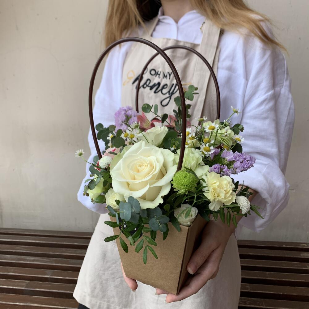 Роза – 1 шт.Роза кустовая – 1 шт.Гвоздика кустовая – 2 шт.Матрикария – 1 шт.Статица – 1 шт.Фисташка – 1 шт.Эвкалипт – 1 шт.Сумочка – 1 шт.Альстромерия – 1 шт.