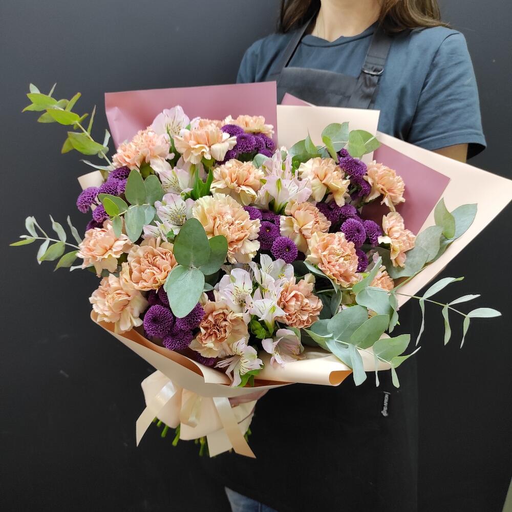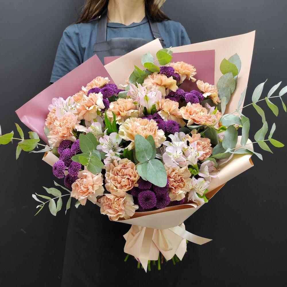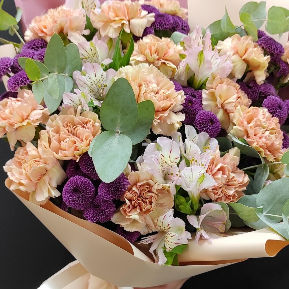 Альстромерии, Гвоздики, Кустовые розы, Лизиантусы, Розы, Хризантемы