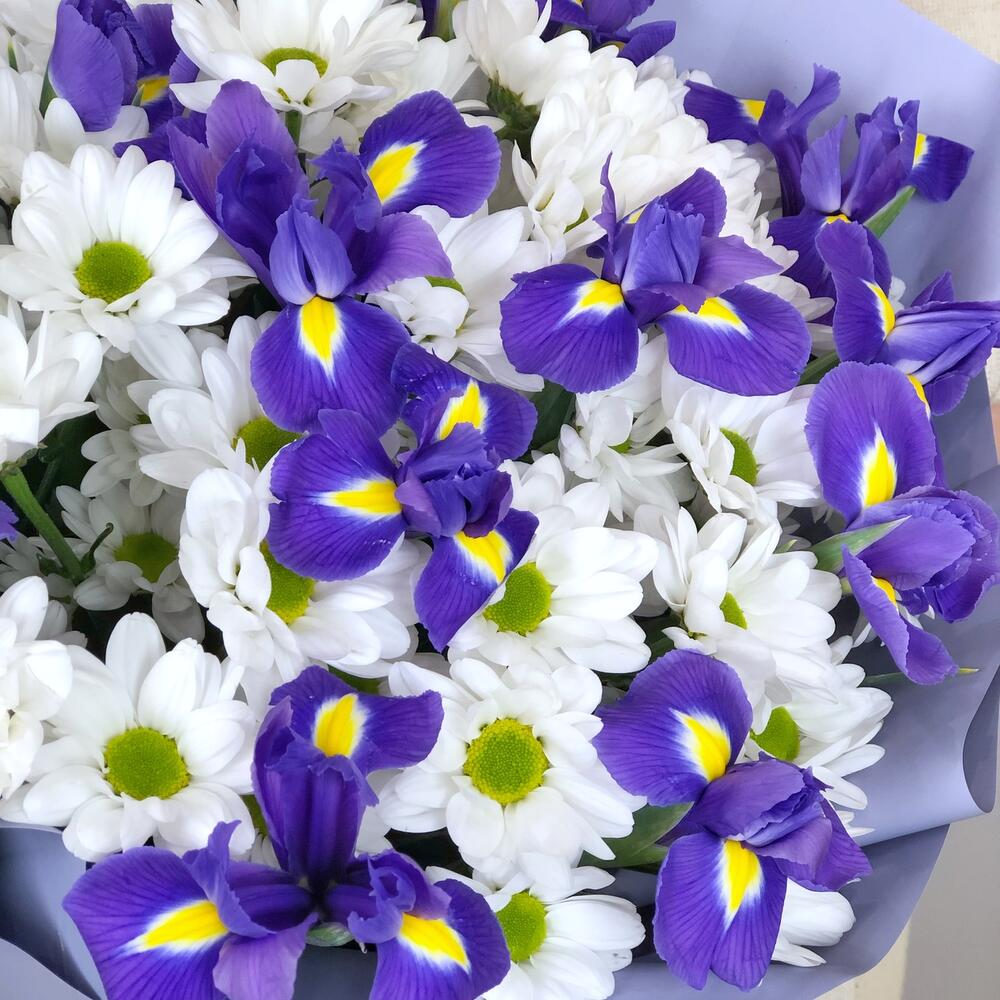 Хризантема кустовая – 7 шт.Ирис – 13 шт.Упаковка дизайнерская – 1 шт.