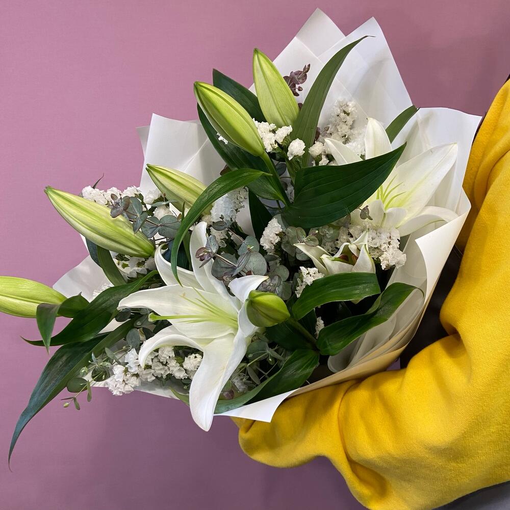 Лилия белая – 3 шт.Статица – 2 шт.Эвкалипт – 3 шт.Корейская упаковка – 1 шт.бант атласный – 1 шт.