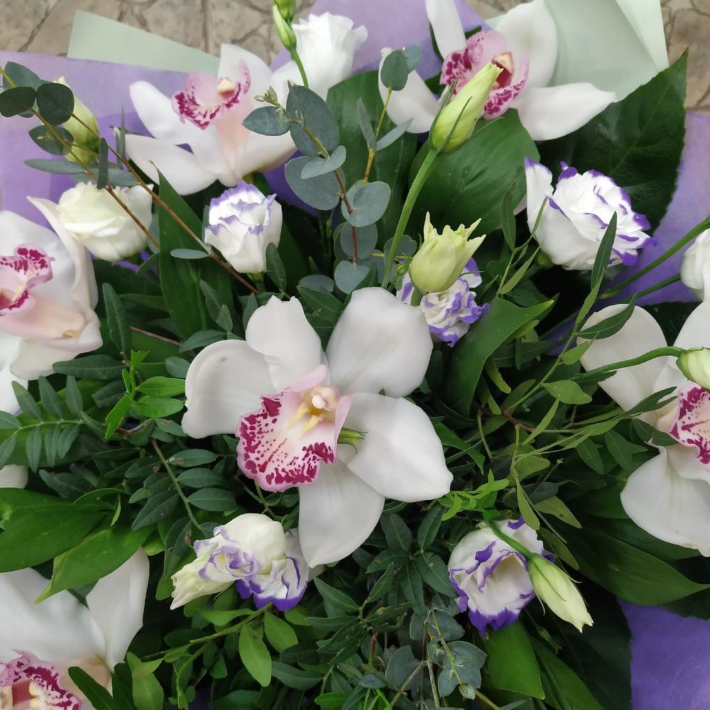 Орхидея Цимбидиум – 7 шт.Лизиантус – 5 шт.Эвкалипт – 3 шт.Фисташка – 3 шт.Упаковка дизайнерская – 1 шт.