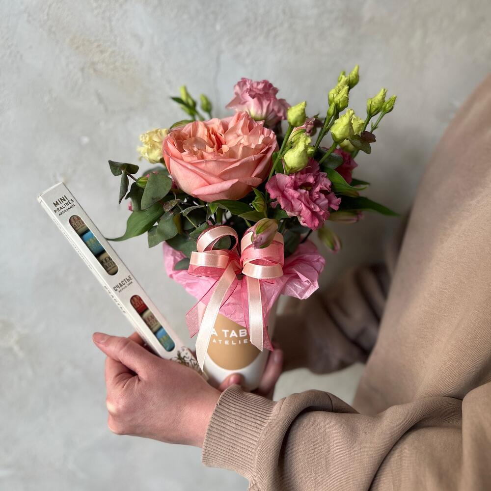 Альстромерия – 1 шт.Лизиантус – 1 шт.Эвкалипт – 1 шт.пинк экспрешн – 1 шт.стакан крафт – 1 шт.набор шоколада «счастье» – 1 шт.
