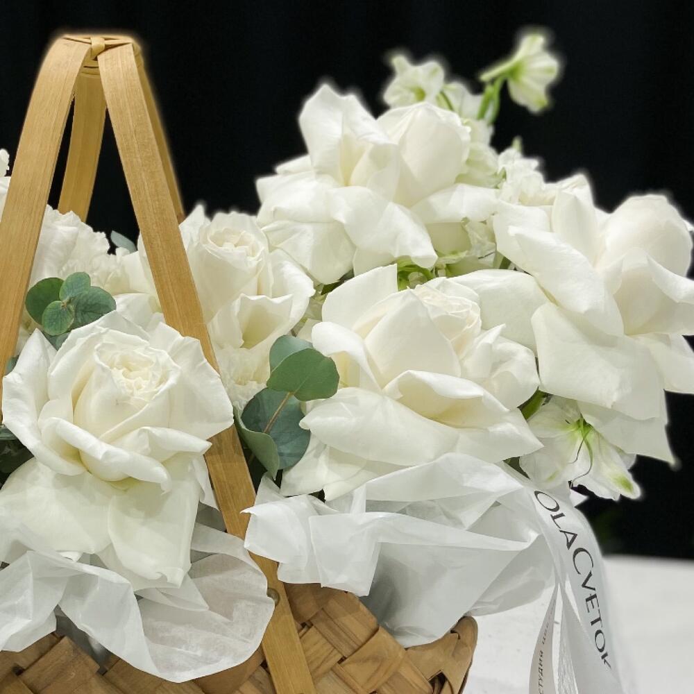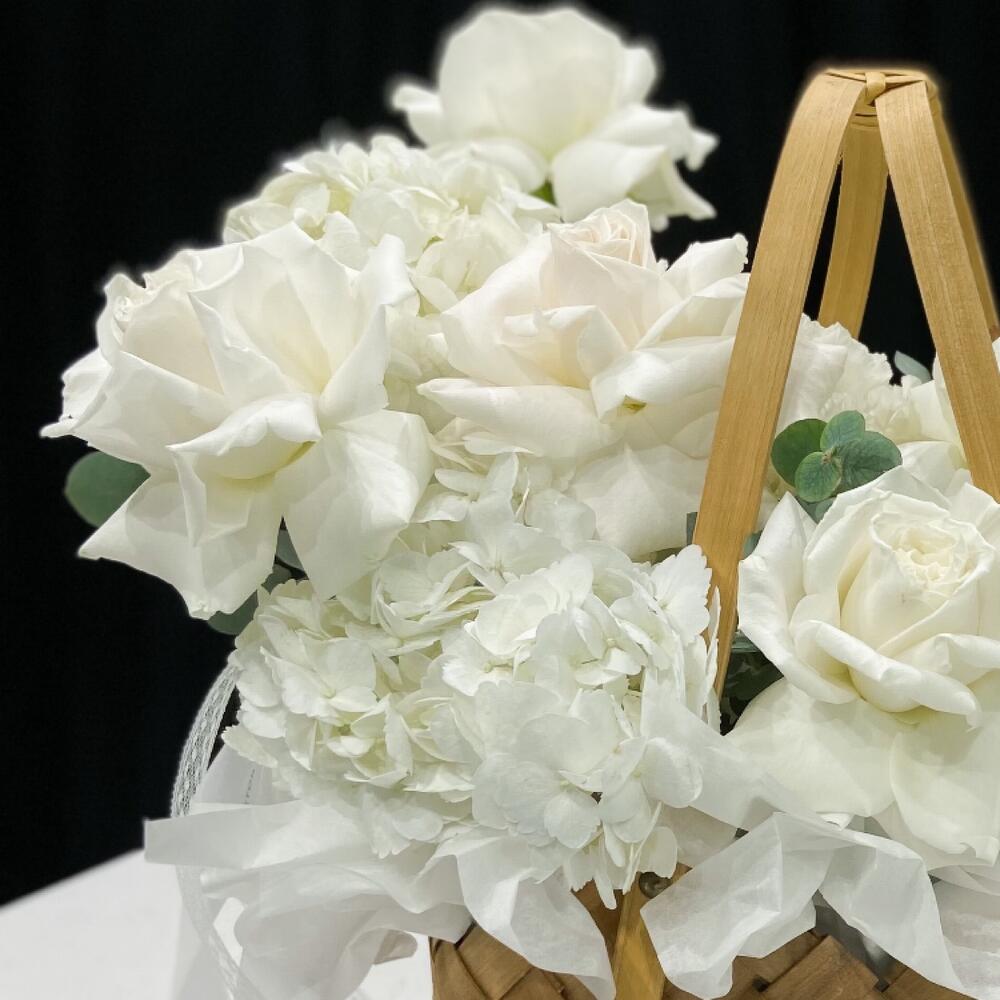 Гортензия – 2 шт.плая бланка – 11 шт.Эустома – 4 шт.Лукошко плетеное – 1 шт.Тишью – 5 шт.Эвкалипт – 7 шт.Лента атласная – 6 шт.
