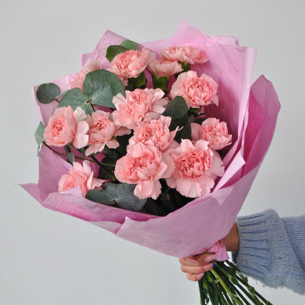 Гвоздика сортовая розовая – 15 шт.Эвкалипт – 3 шт.Упаковка дизайнерская – 1 шт.