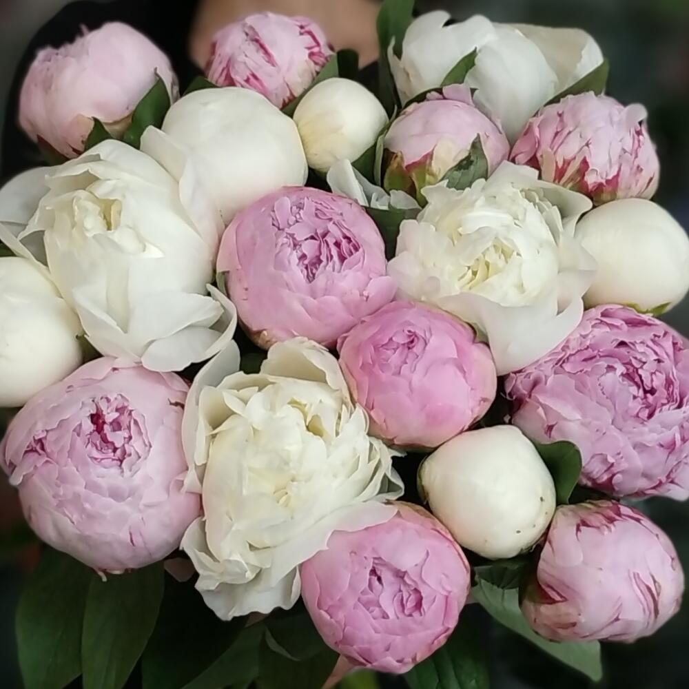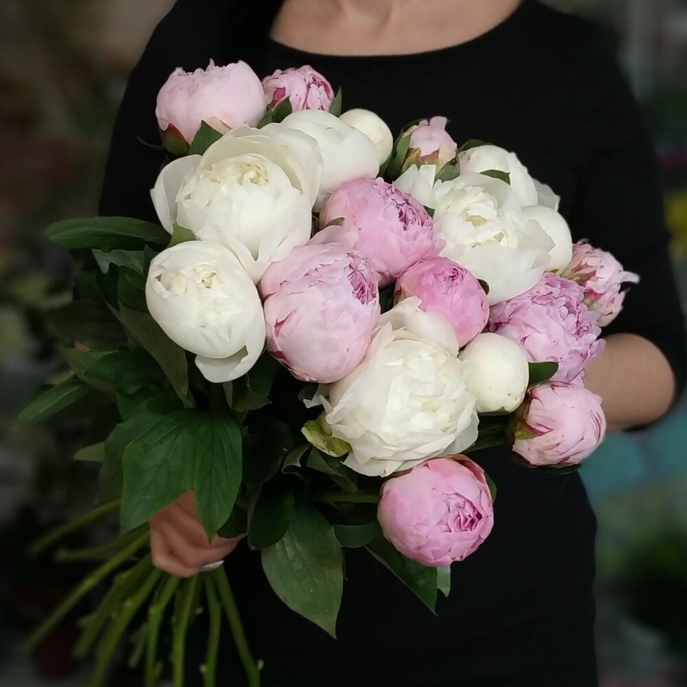 Лента атласная – 1 шт.Пион белый – 9 шт.Пион розовый – 10 шт.