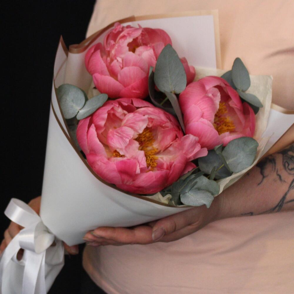 3 коралловых пиона с эвкалиптом