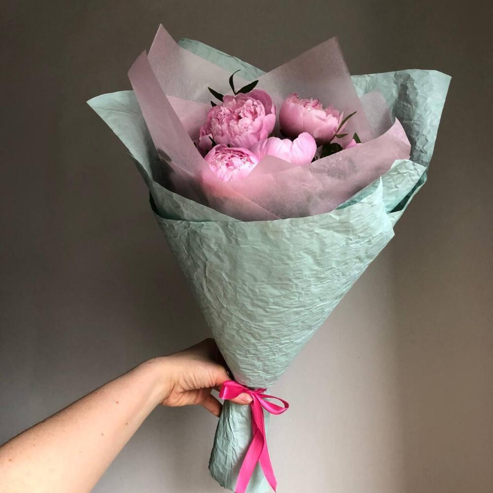 5 пионов розового цвета в яркой весенней упаковке