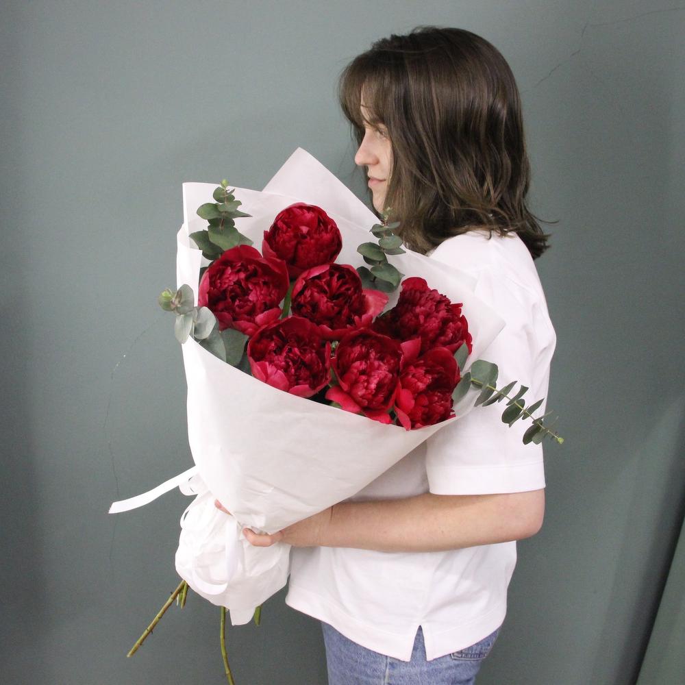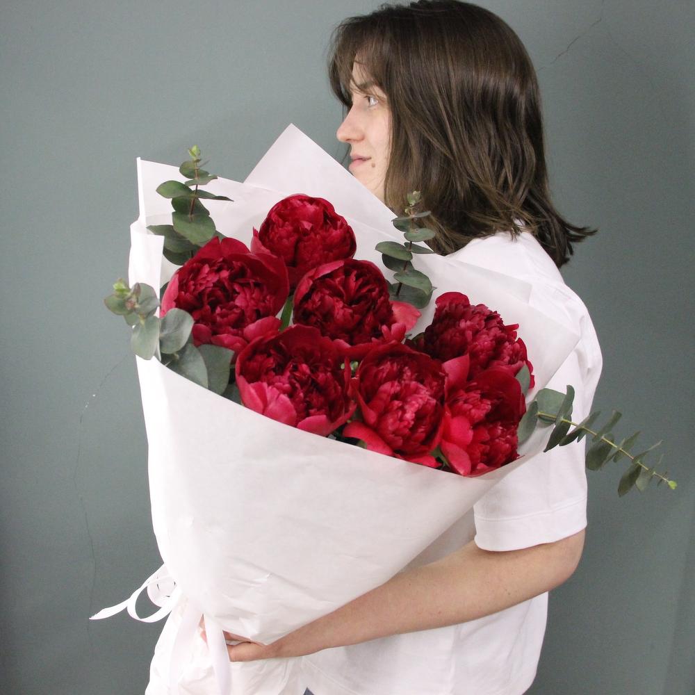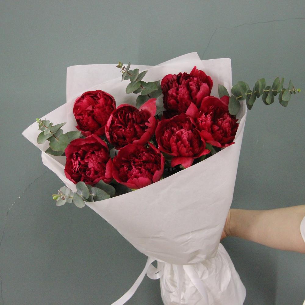 Пион – 7 шт.Эвкалипт – 4 шт.Лента атласная – 1 шт.Бумага – 2 шт.