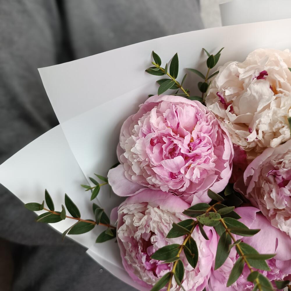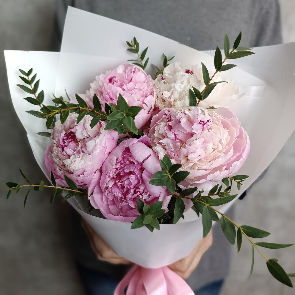 Пион Сара Бернар – 5 шт.Эвкалипт – 1 шт.Упаковка дизайнерская – 1 шт.Лента атласная – 2 шт.