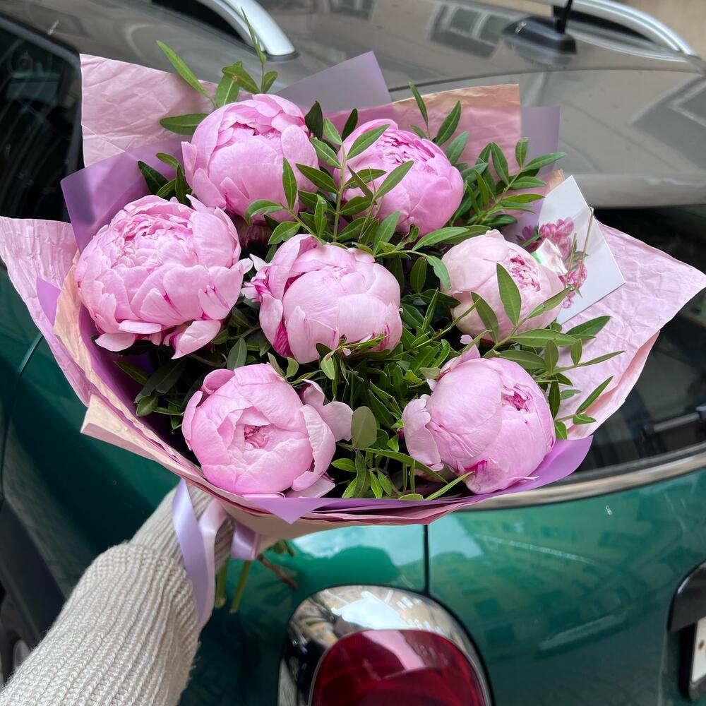 Упаковка – 2 шт.Лента атласная – 2 шт.Фисташка – 3 шт.Пион Сара Бернар – 7 шт.