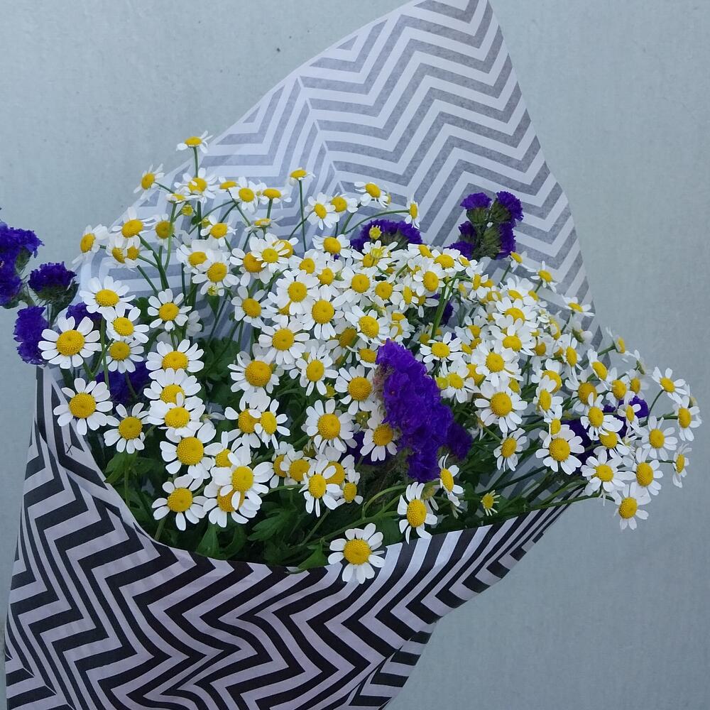 Статица – 1 шт.Лента атласная – 1 шт.Крафт упаковка – 1 шт.Матрикария (Ромашка Камила) – 5 шт.
