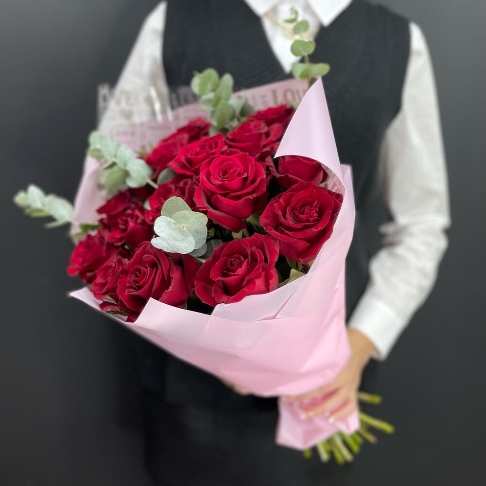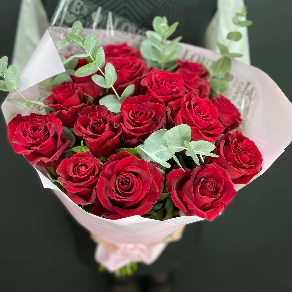 17 красных роз с эвкалиптом