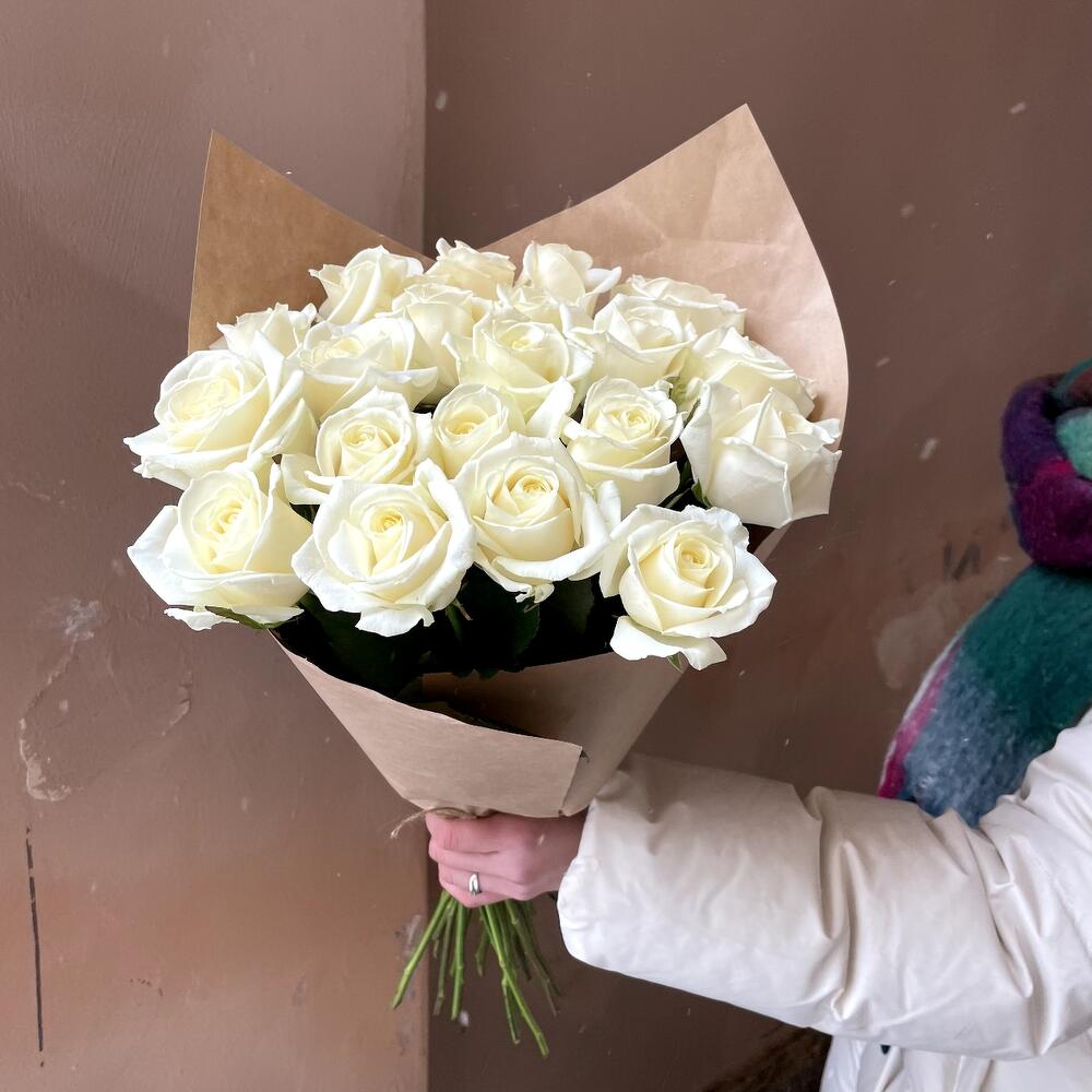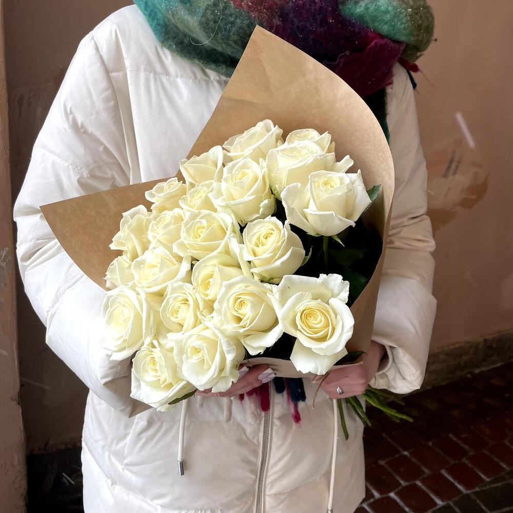 Крафт упаковка – 1 шт.Роза россия белая – 21 шт.
