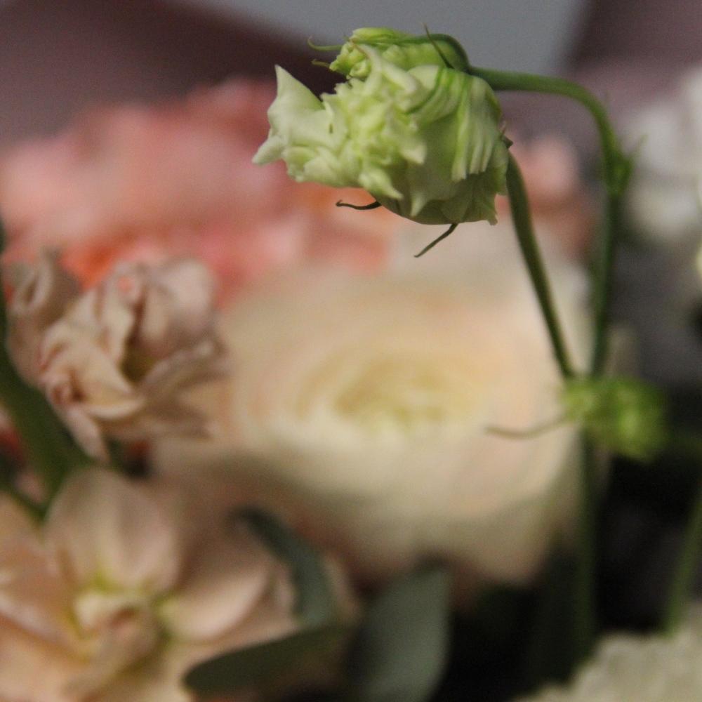 Ранункулюс – 3 шт.Роза кустовая пионовидная – 2 шт.Маттиола – 3 шт.Лизиантус – 2 шт.Эвкалипт – 5 шт.Тишью – 2 шт.Бумага – 2 шт.Лента – 1 шт.