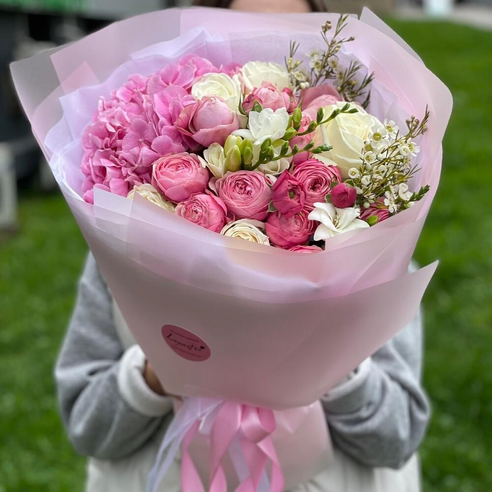 Альстромерии, Гортензии, Кустовые розы, Лизиантусы, Розы, Хризантемы