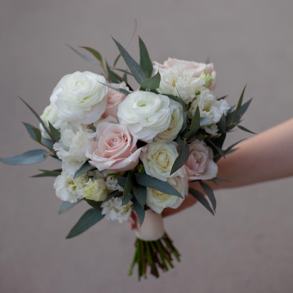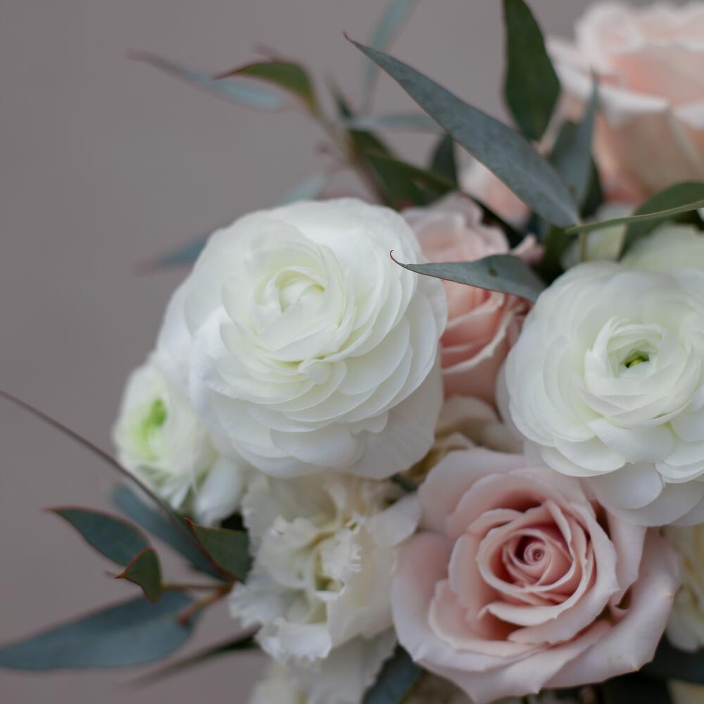 Ранункулюс – 2 шт.Лизиантус – 3 шт.Эвкалипт – 6 шт.Кустовая роза – 3 шт.Роза – 7 шт.Диантус – 3 шт.коробка-переноска – 1 шт.ваза транспортировочная – 1 шт.