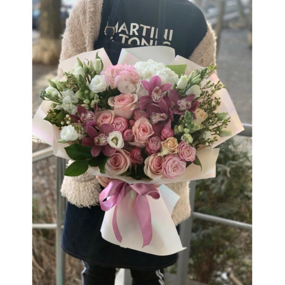 Альстромерии, Гвоздики, Кустовые розы, Лизиантусы, Розы, Хризантемы