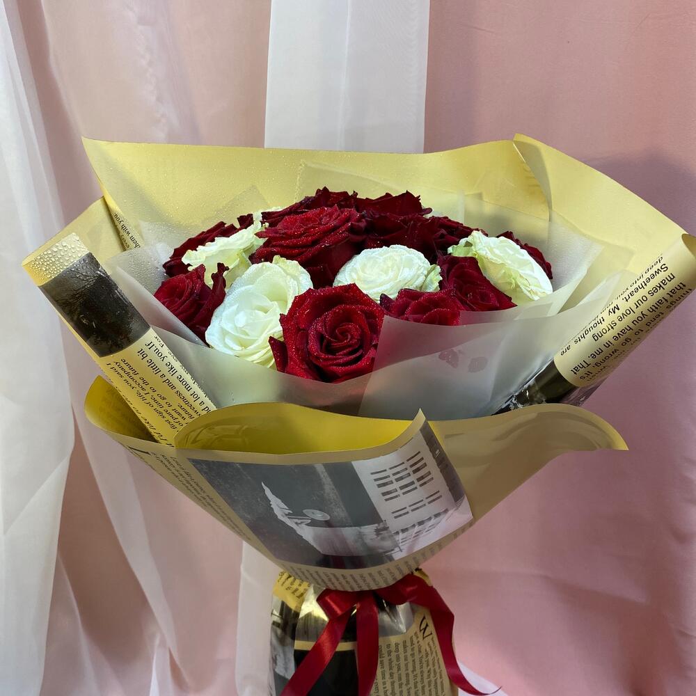Роза белая 50 см – 6 шт.роза красная 60 см эквадор – 11 шт.Упаковка дизайнерская – 2 шт.
