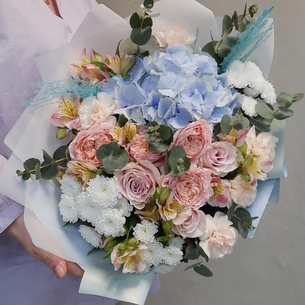 Букет с голубой гортензией и пион розой
