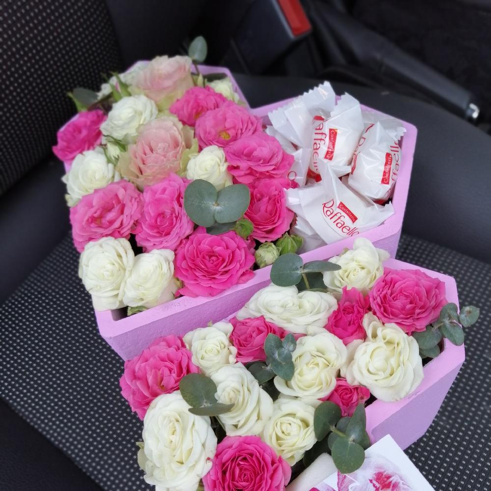 “Сладкое сердце ” – цветочная композиция с сладостями в коробке “Сердце”