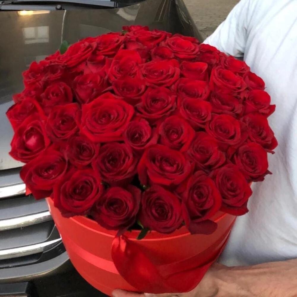 розы эквадор (60 см) – 51 шт.Шляпная коробка – 1 шт.Оазис флористический – 2 шт.Лента атласная – 1 шт.