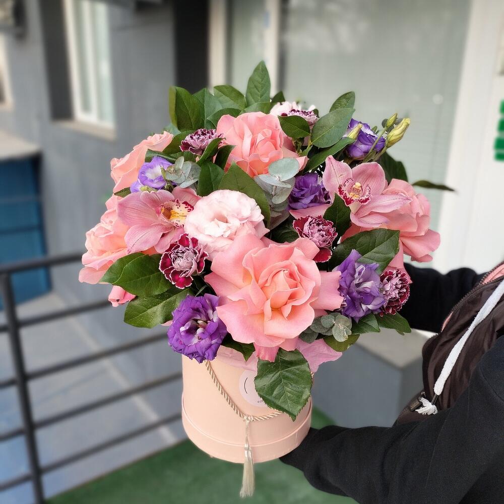 Гвоздики, Лизиантусы, Розы, Тюльпаны