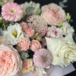 Цветы в коробке из пионовидныз роз, хризантем и Гербер