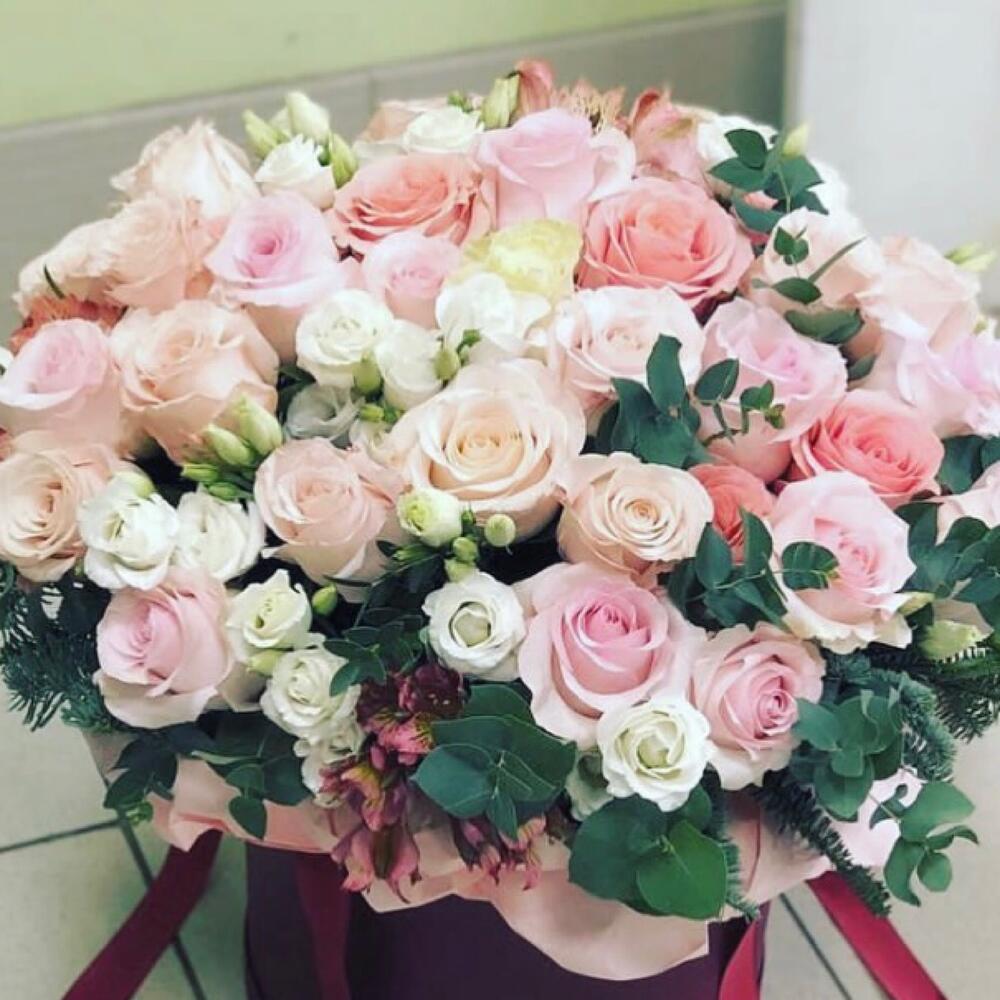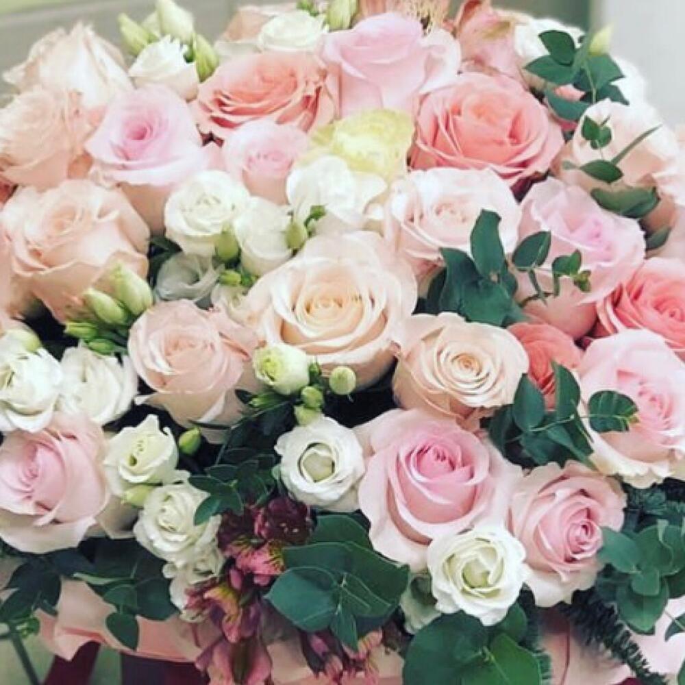 Альстромерии, Гвоздики, Кустовые розы, Лизиантусы, Розы, Хризантемы