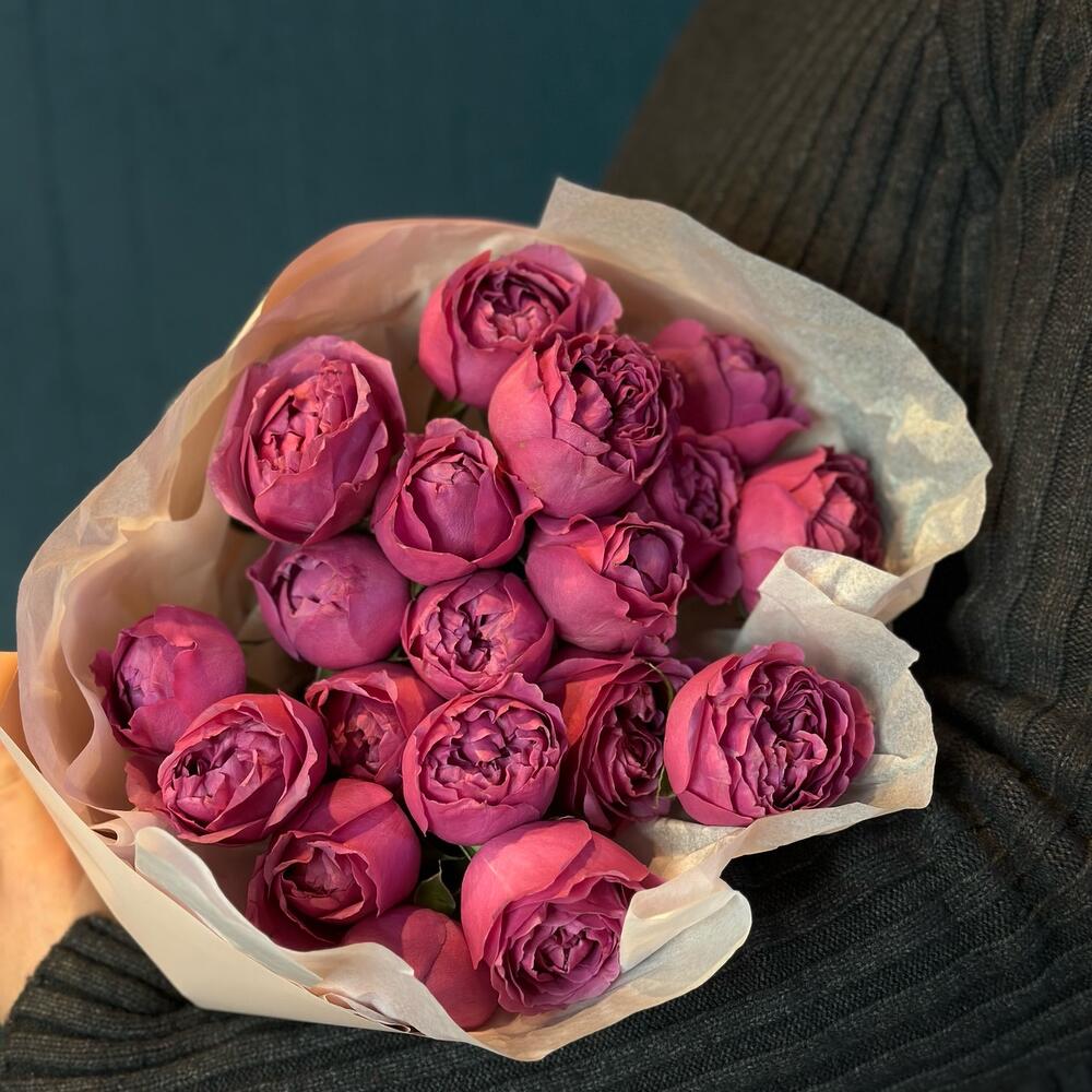 Лента атласная – 1 шт.Тишью – 1 шт.Пионовидная кустовая роза – 7 шт.Пленка матовая – 1 шт.