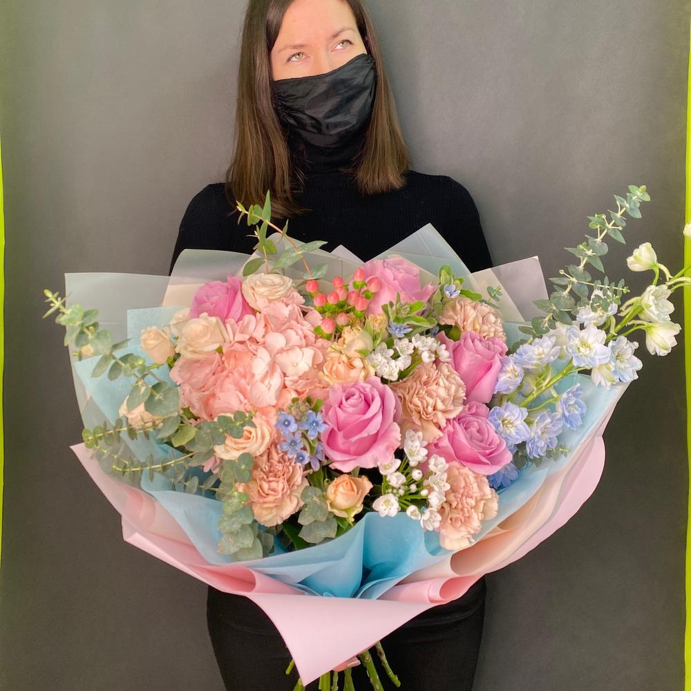 Гиперикум – 1 шт.Роза кустовая – 2 шт.Роза Эквадор – 5 шт.Диантус – 4 шт.Упаковка дизайнерская – 1 шт.Гортензия розовая – 1 шт.Эвкалипт Baby Blue – 3 шт.Дельфиниум голубой – 1 шт.аллиум кустовой – 3 шт.твидия гол – 3 шт.