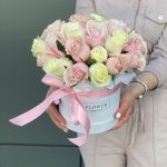 Роза розовая – 15 шт. Роза белая – 10 шт. Коробка – 1 шт. Оазис – 1 шт.